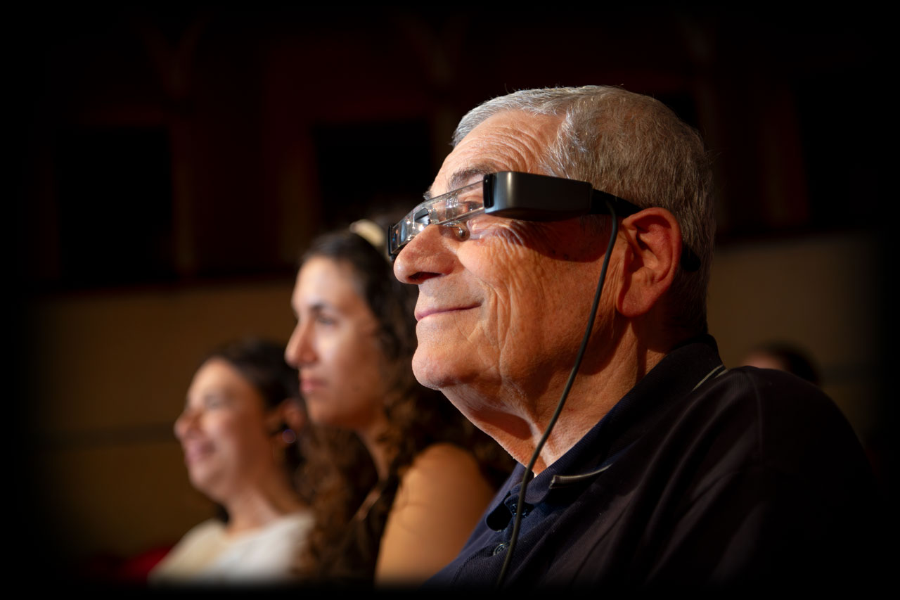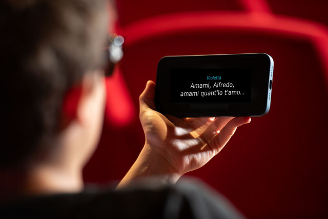 Texts shown on smartphones and tablets displays are synchronized in real time with the opera libretto, thanks to commands given by an operator.